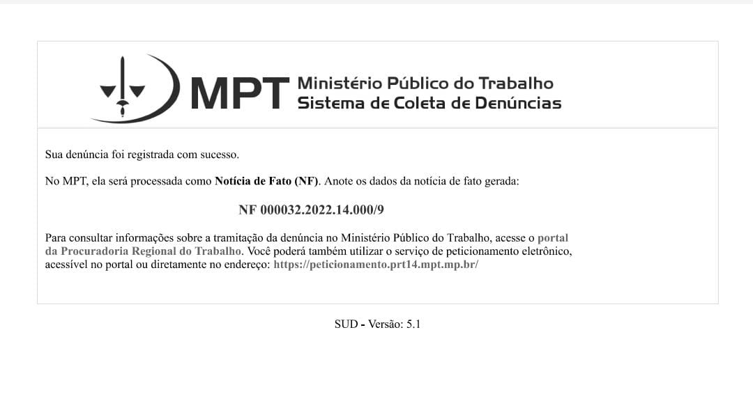 O sindicato aguarda manifestação do Ministério Público do Trabalho quanto a denúncia apresentada pelo Sindicato para saber quais as medidas serão adotadas.
