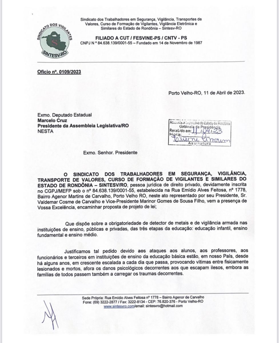 O SINDICATO DOS VIGILANTES DO ESTADO DE RONDÔNIA – SINTESV/RO, na manhã desta terça-feira o Vice-Presidente, Marinor Filho, foi protocolar um oficio no gabinete do Dep. Estadual Marcelo Cruz através da sua Assessora Jacqueline Suzana Rivoredo, devido os fatos que esta ocorrendo em todo o Brasil de tragédias. Que dispõe sobre a obrigatoriedade de detector de metais e de vigilância armada nas instituições de ensino, públicas e privadas, das três etapas da educação: educação infantil, ensino fundamental e ensino médio.