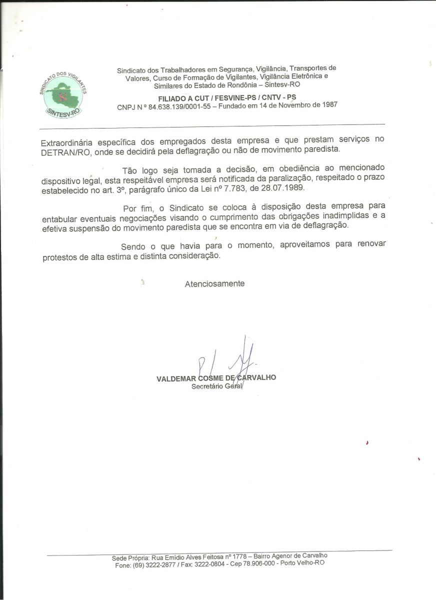 O sindicato procurou o diretor financeiro do DETRAN/RO para cobrar sua responsabilidade de fiscalização do contrato como não obtiveram resposta na manha de hoje protocolarão oficio de paralisação, caso o pagamento dos vigilantes não seja realizado na data de hoje.